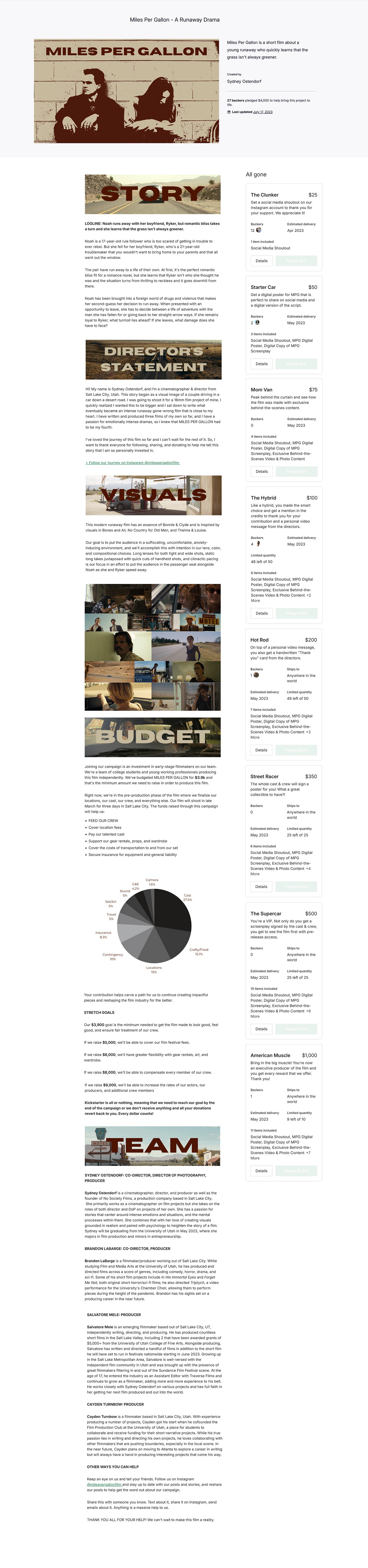 Developed the creative vision for Miles Per Gallon, a coming-of-age short film - from pitch deck and visual direction to promotional campaign. Directed the film's cinematography and designed campaign materials that successfully funded the project to 102% of its crowdfunding goal.